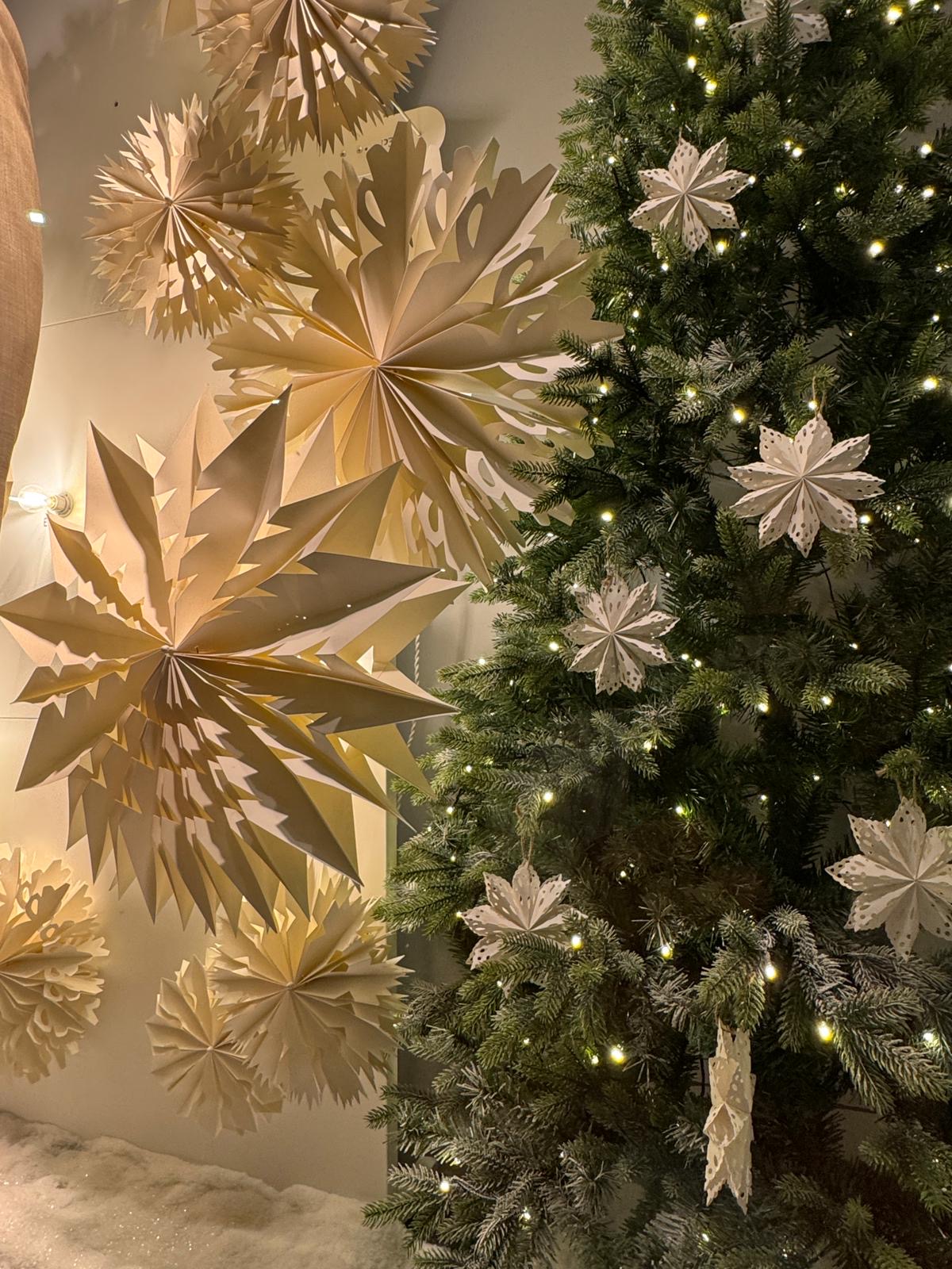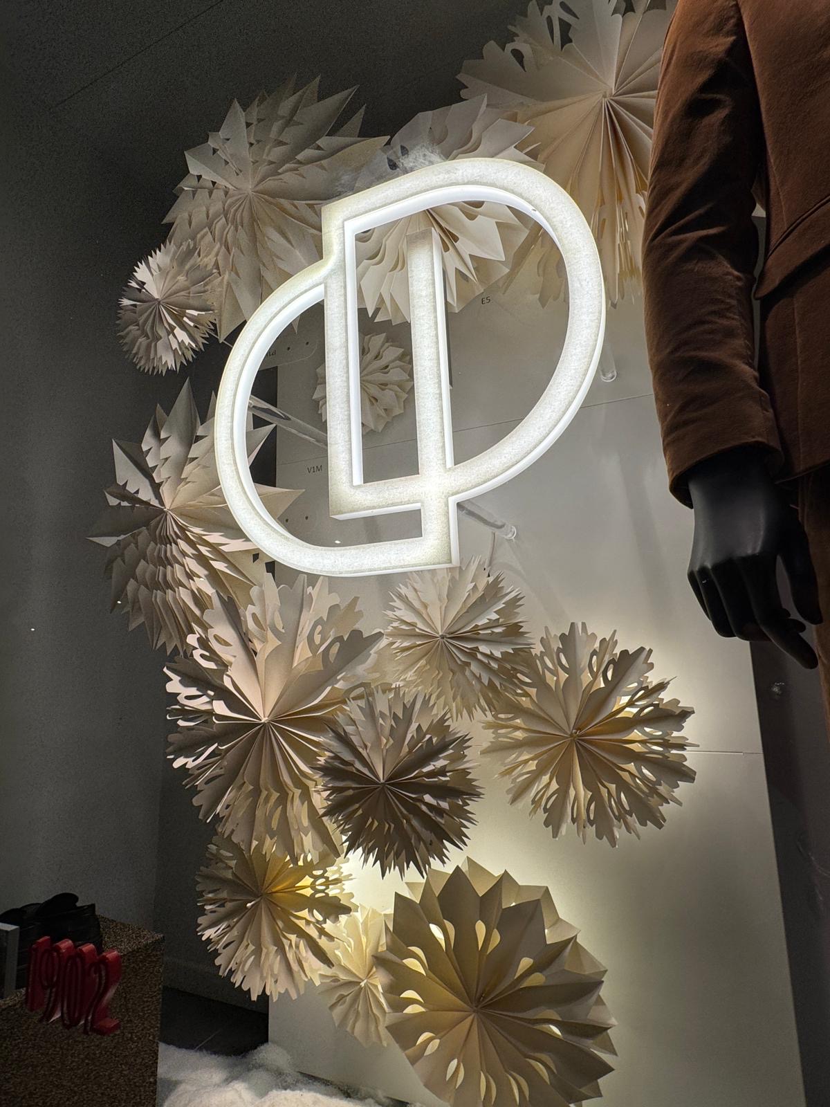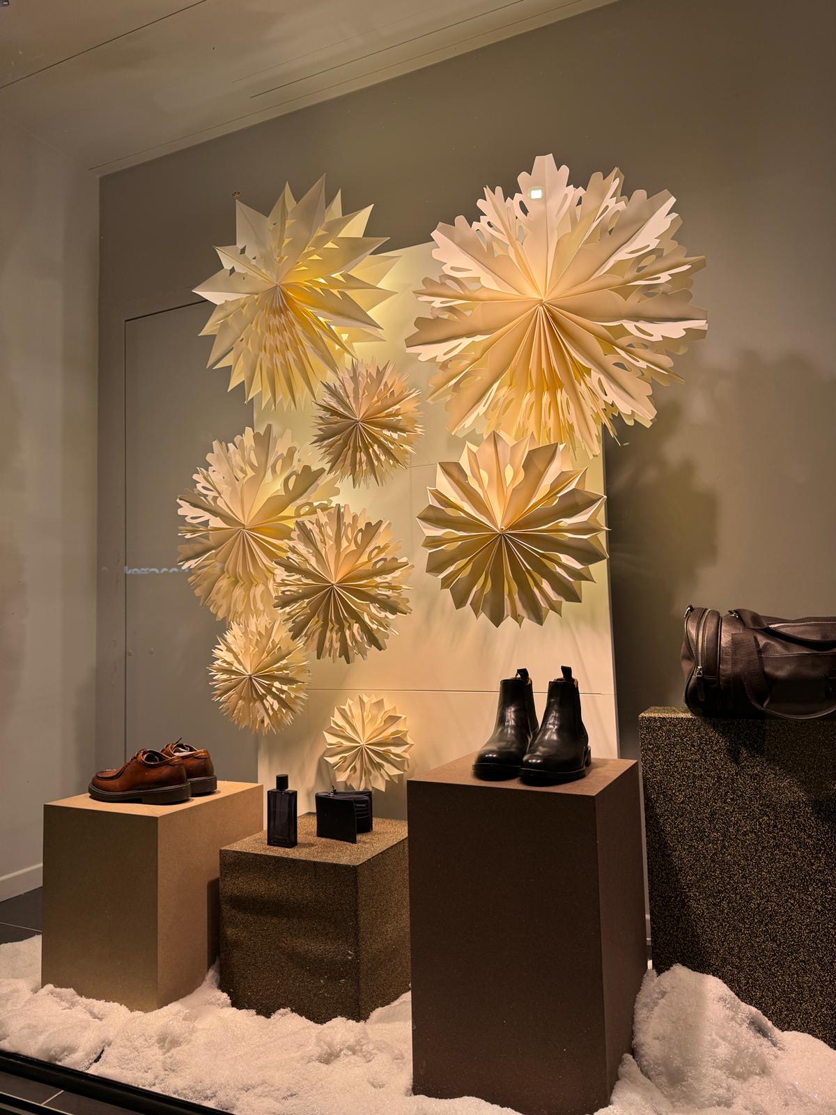 Des vitrines de Noël pensées comme une parenthèse chaleureuse : au-delà de la magie des fêtes, elles diffusent une atmosphère douce et enveloppante. Un travail d’éclairage subtil vient renforcer cette sensation de chaleur, révélant les reliefs et la délicatesse de flocons de papier inspirés de l’art de l’origami. La lumière sublime le papier et met en valeur un savoir-faire artisanal et traditionnel, tout en poésie.